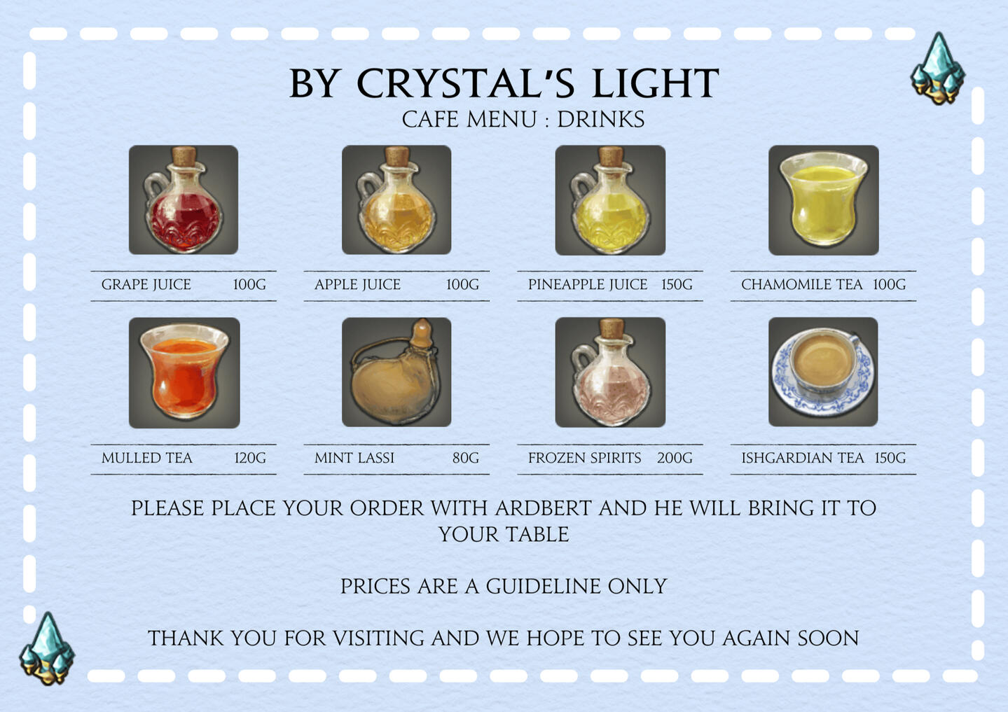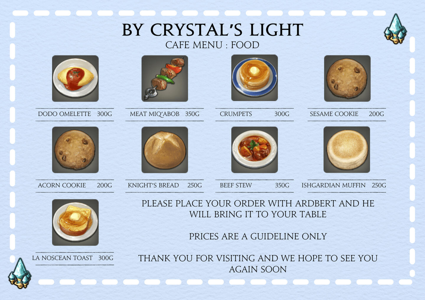 Swing by to visit a delightful, light and airy café and be served personally by Ardbert, the retired Warrior of Light!All food and drinks are made on site by the owner, sometimes right by your table!A gentle, enjoyable ambiance plays from the Orchestrion, where you and your adventuring party of weary travellers can take a load off and relax.